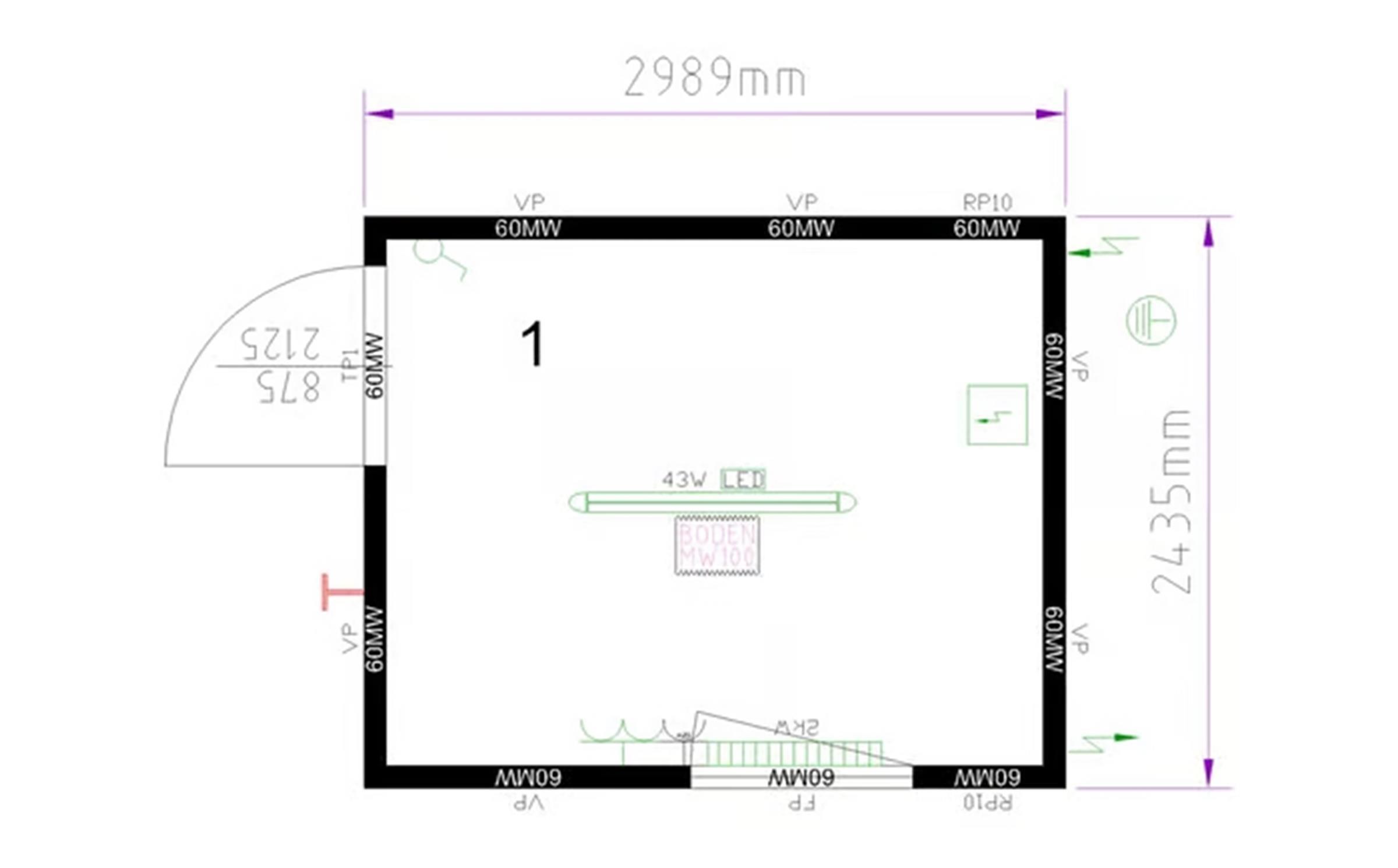 - Doppelsteckdosen, Beleuchtung und Schalter gem. Skizze