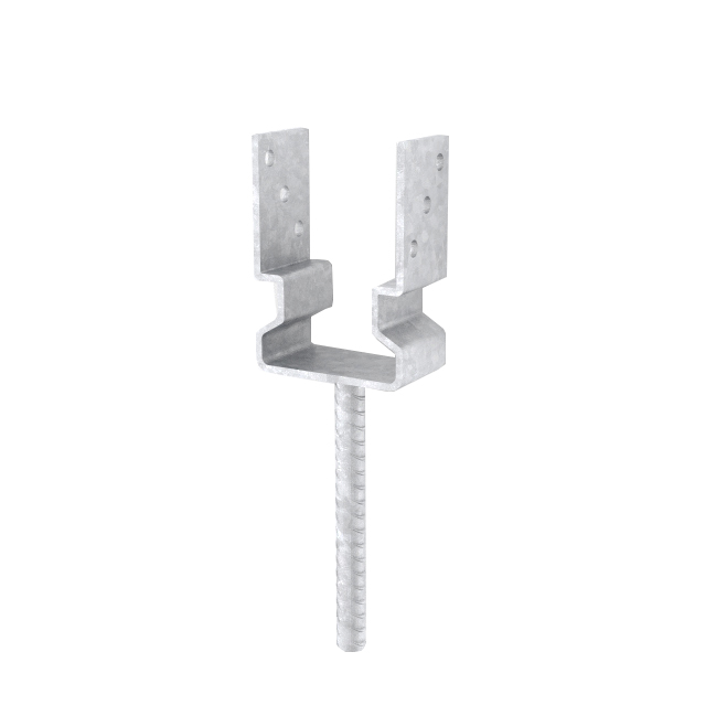 - Pfostenträger in U-Form mit Stange zum einbetonieren, geeignet für quadratische oder rechteckige Pfosten in jeder Breite